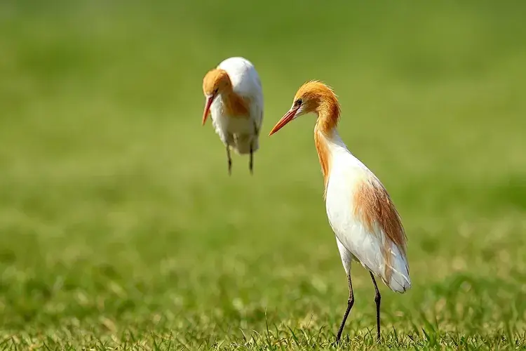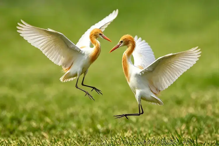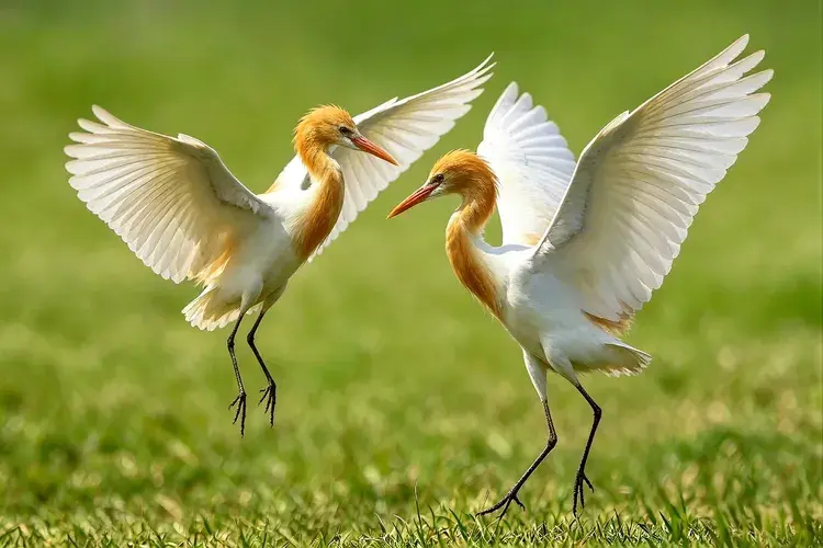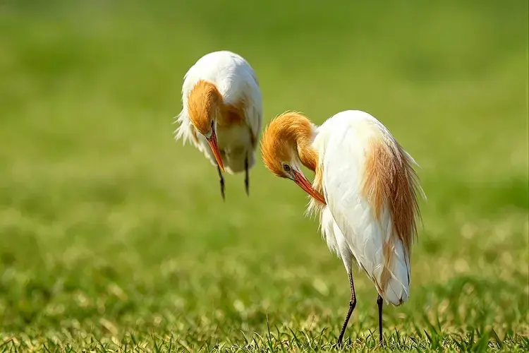 两只牛背鹭相对伫立整理羽翼,黑腿稳稳立在青草丛中,栗色羽冠轻颤,双翼舒展如薄纱,俯身似在亲昵低语。没有喧嚣的争抢,只有这般温柔的相伴。